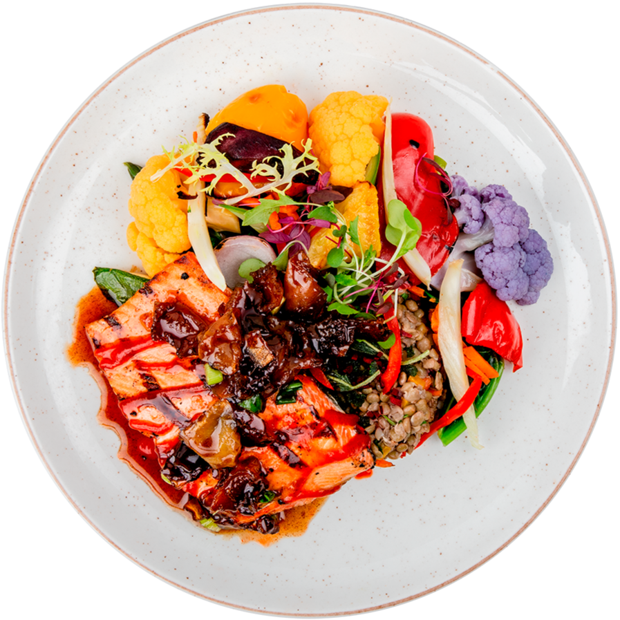 With green lentils (salmon, apples, ginger, tamari, sriracha sambal olek, chives, apples, garlic, lemon, salt, black pepper)