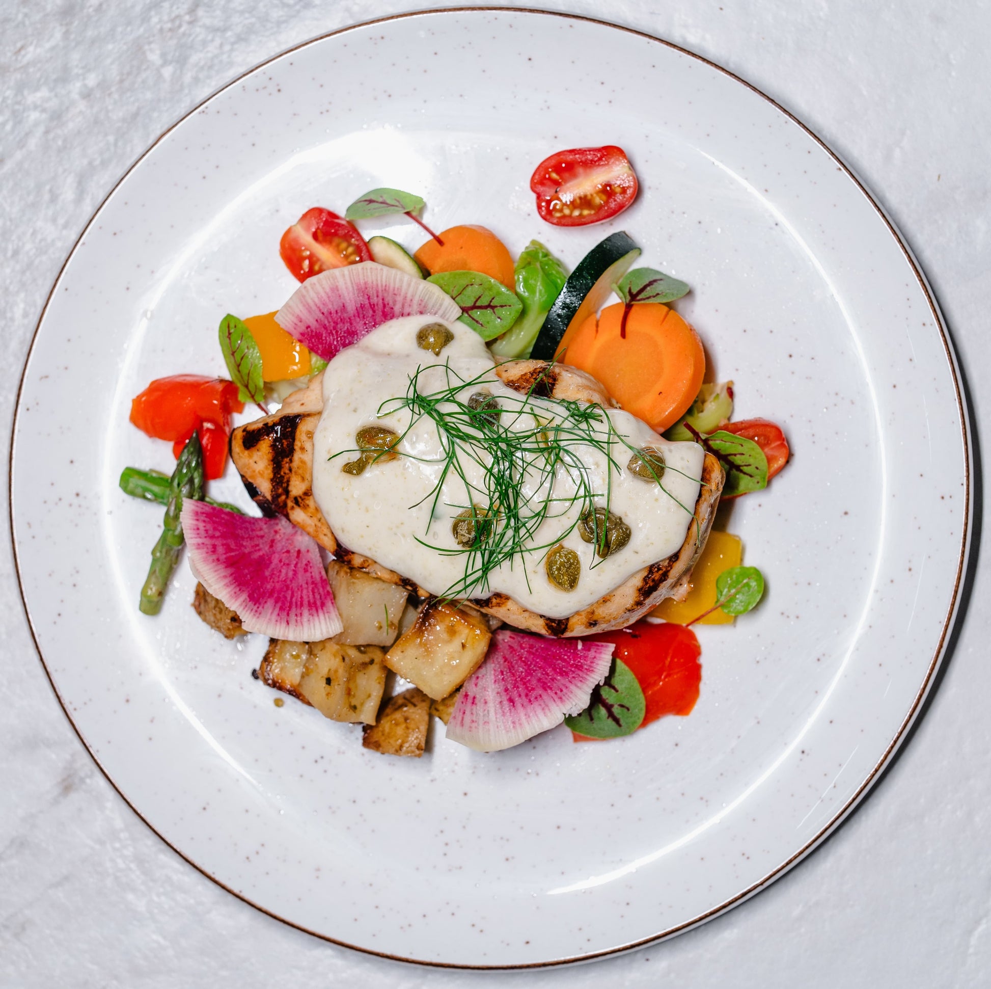 with roasted potatoes and seasonal vegetables (chicken breast, onion powder, garlic powder, sweet and smoked paprika, lemon, dill, caper, onion, garlic, salt, black pepper)