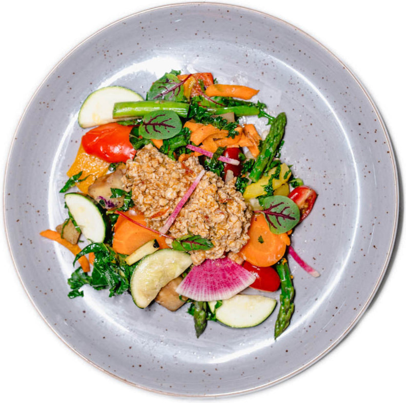 With seasonal vegetables (lean ground turkey breast, onion, garlic, green onion, ginger, gluten free hoisin sauce, gluten free soy sauce, brown sugar, orange, leek, celery, five spice, rice vinegar, salt and black pepper)