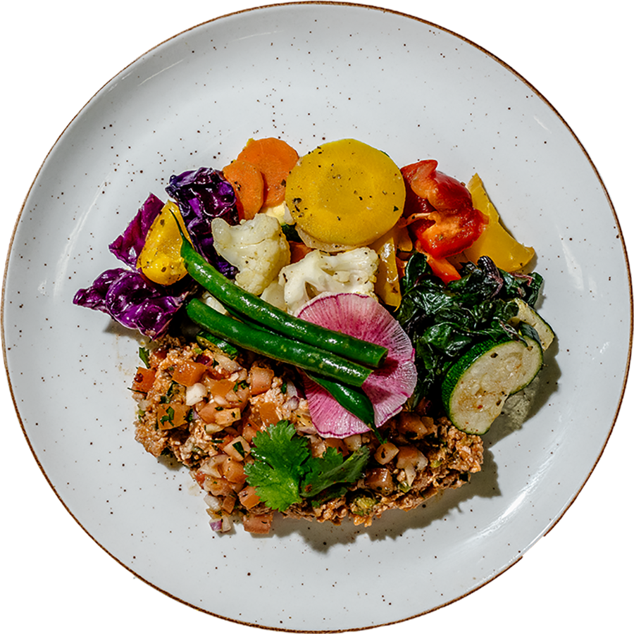 with seasonal vegetables (Lean ground turkey breast, green bell pepper, celery, onion, garlic, tomatoes, olive oil, creole spices, cilantro, salt, black pepper)